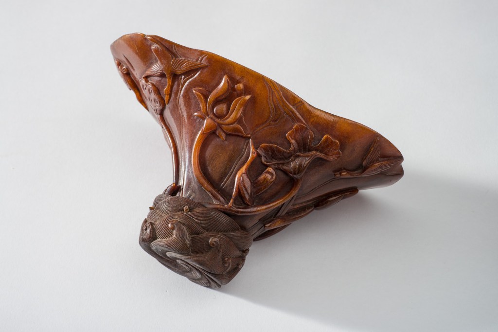 A libation cup is a communal drinking vessel used in religious and important ceremonial rituals. The museum’s libation cup (pictured) has been ornately carved and decorated with lotus flowers and water birds.