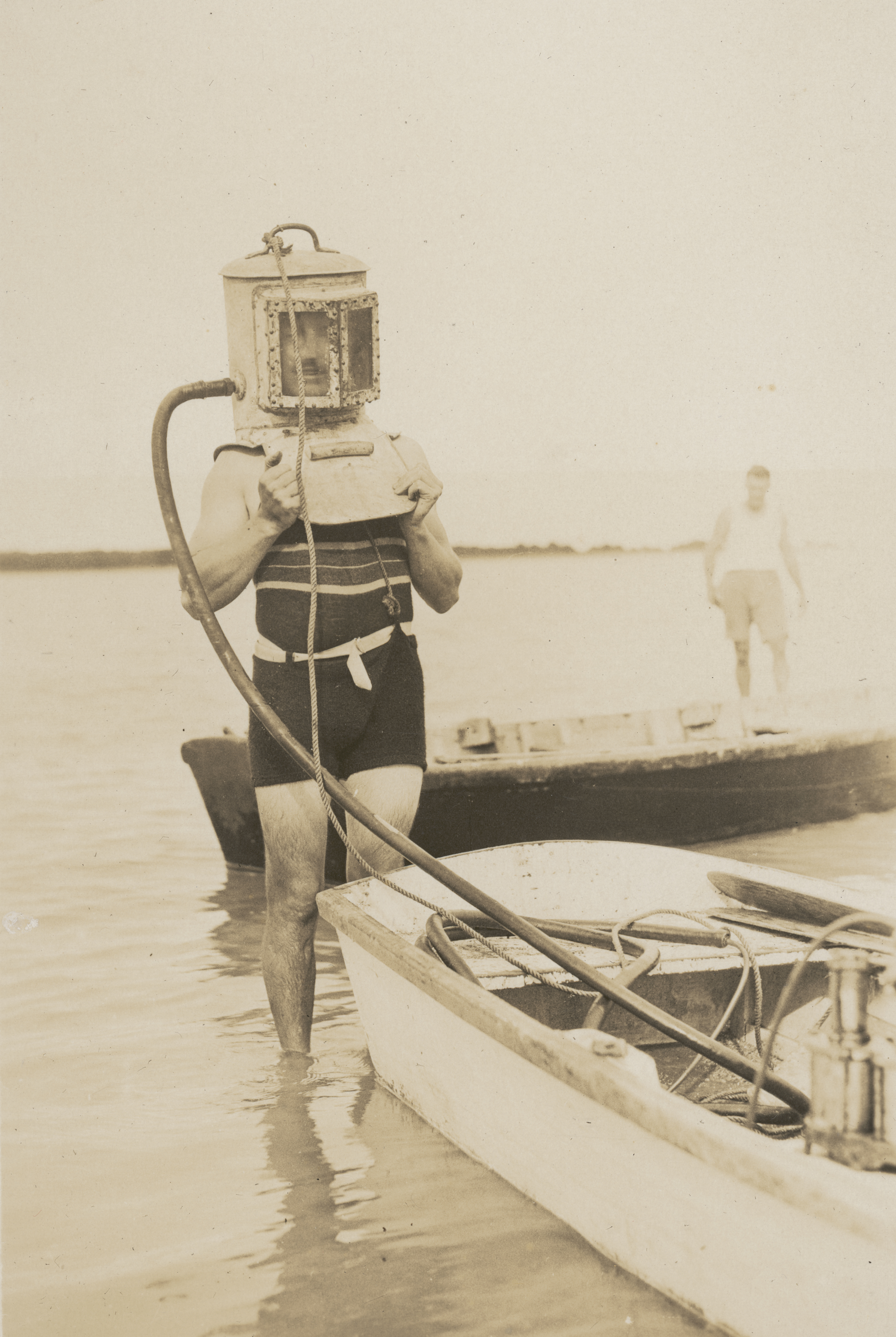 Scientists on the 1928-29 Expedition made good use of the helmet to study the underwater environment at Low Isles, notably around the extensive, shallow corals growing in the anchorage. These were mostly under 5m of water depth at low tide and provided an ideal, sheltered place for its use. Here, the helmet was used extensively for marking corals to track their growth, for the collection of sediment pots and material for experimental work.