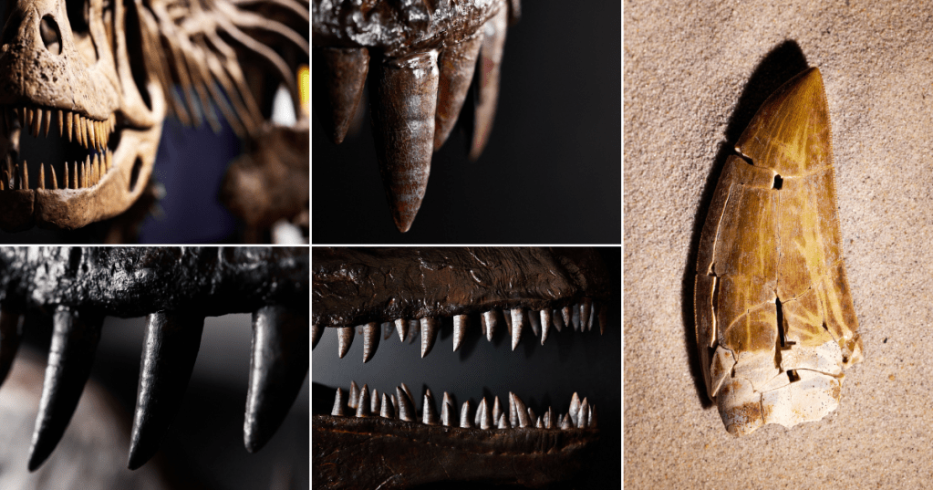 There’s a set of teeth around every corner of the exhibition including giant, real fossilised fangs that were found at the dig site in Patagonia. The Therapod section at the beginning of the exhibition is a particularly good place to find factually sharp angles and shadows that will give you content with teeth!