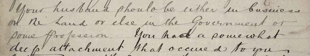 Beta, the fortune teller, outlined a “happy married life” but interestingly didn’t mention love, perhaps hinting at the more transactional role that marriage played at the time. He expected her to marry between 23 and 28 but most likely around age 26. It should be a happy marriage if she chooses a husband wisely. Beta advised,