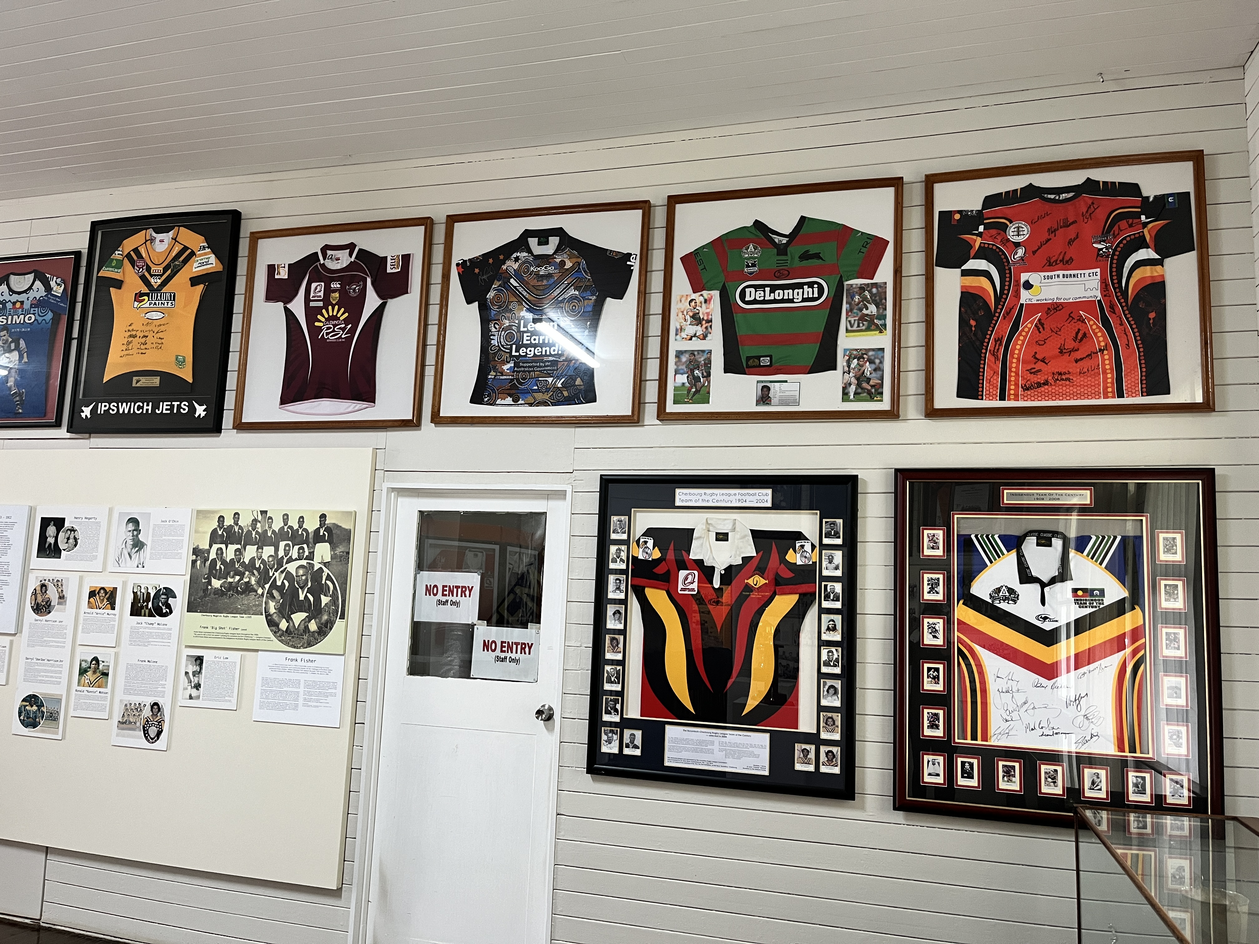 As mentioned, I ended my tour in Play the Ball – sport in Cherbourg, which was such a positive space to finish, celebrating the place Cherbourg is today. And what better way to do it than displaying sporting excellence through signed NRL shirts, ginormous trophies, and fantastic stories of Olympic medals. I kept thinking how much my late father, Rod would have loved this exhibition being such a huge NRL fan, particularly of the underdogs.