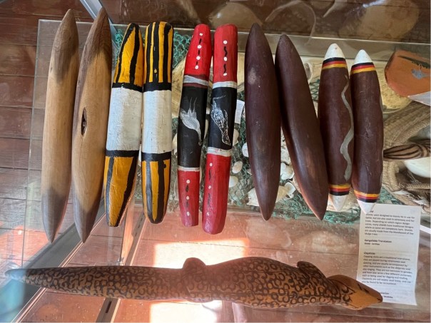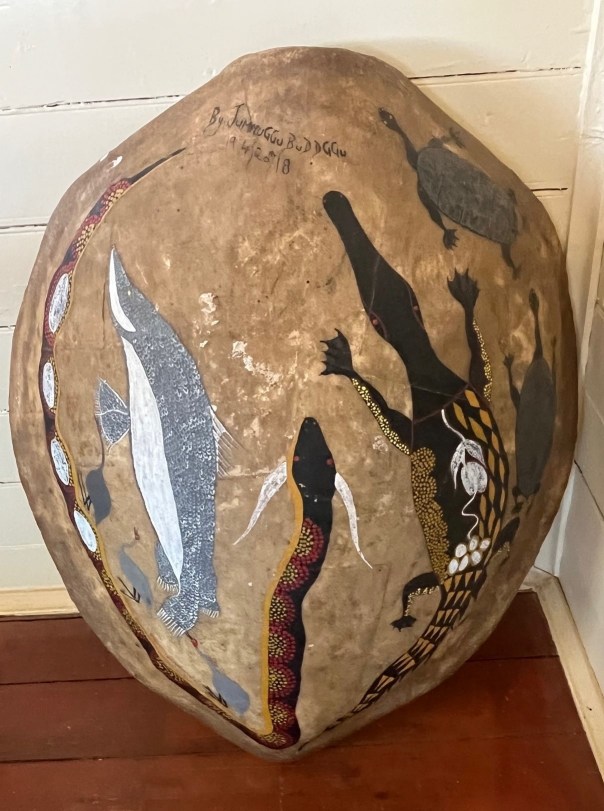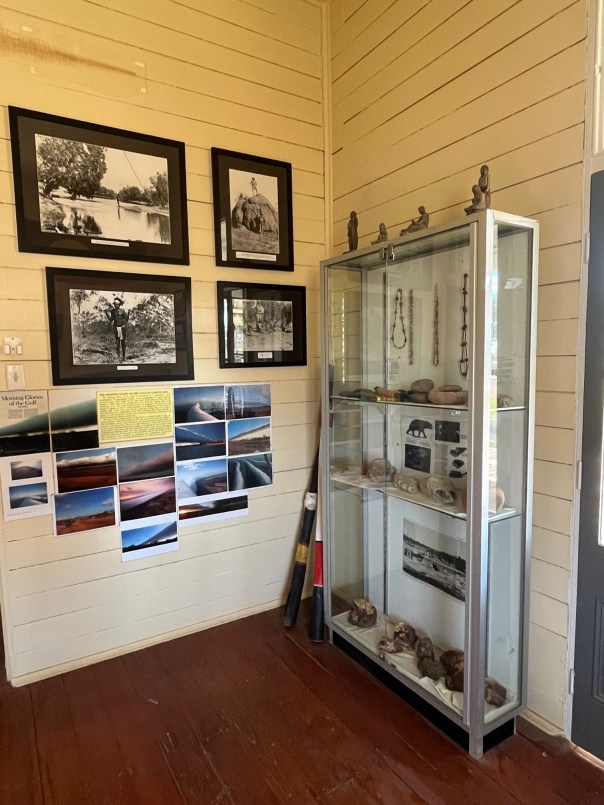 Our final destination is Burketown. Here the Burketown Visitor Centre in the old Post Office Building still houses material culture that showcases Gangialida and Garawa culture. Contemporary paintings, traditional artefacts and interpretative panels that highlight the high court Crocodile Case showcase the continuing culture associated with this region. Ewen and I were fortunate enough to help develop the display a few years ago, and it’s great to see it’s still going strong (with some improvements) after two years of heavy wet season rains.