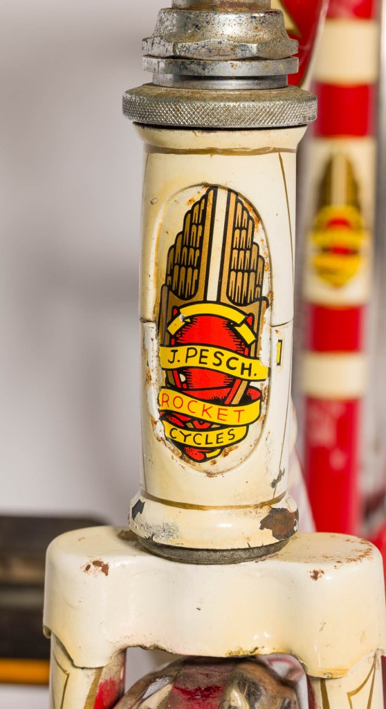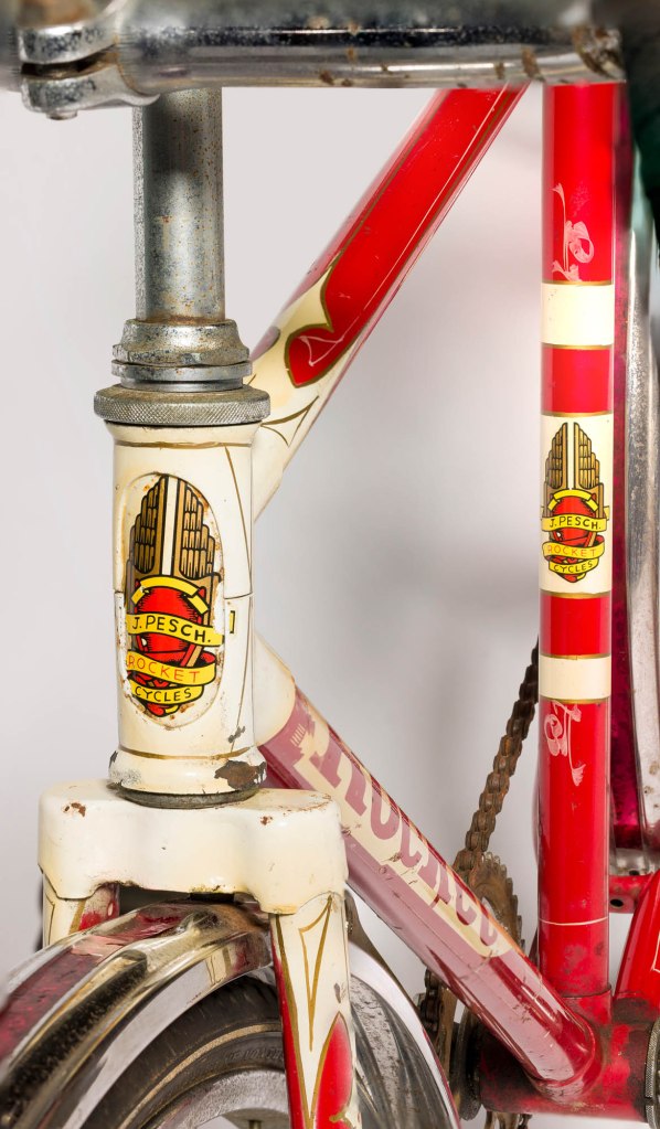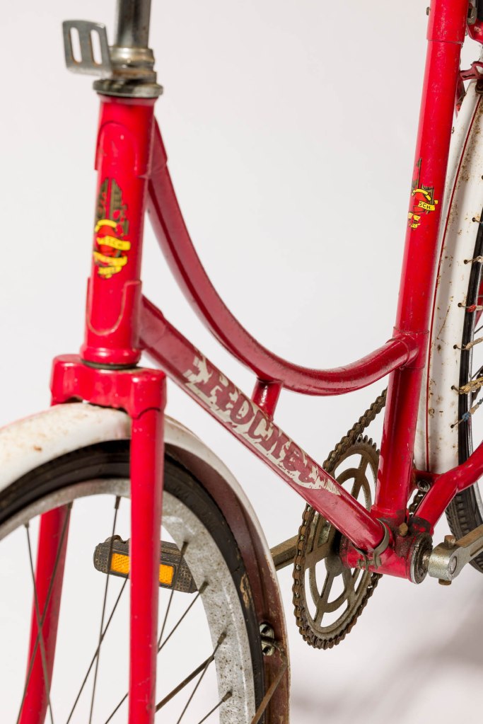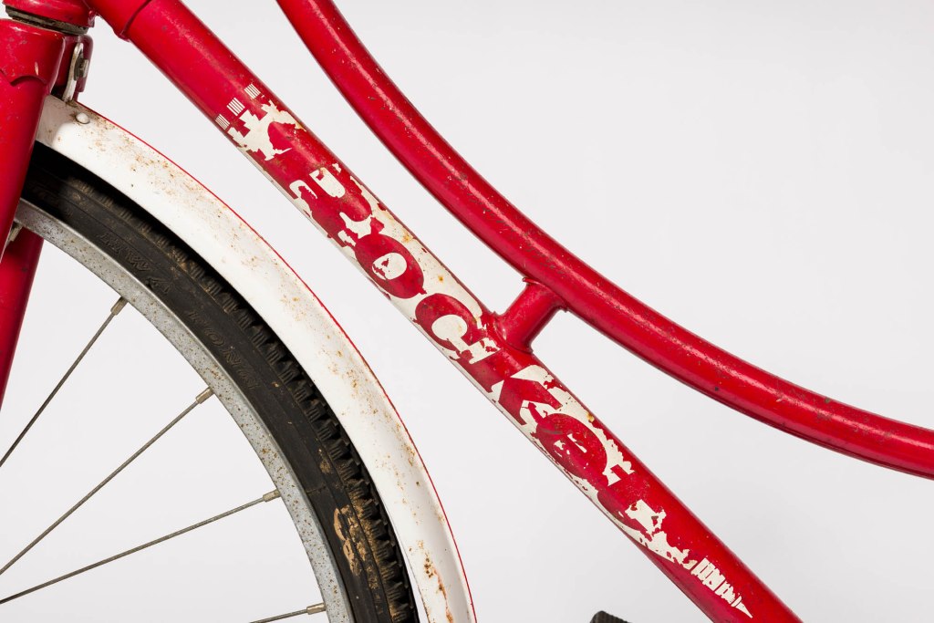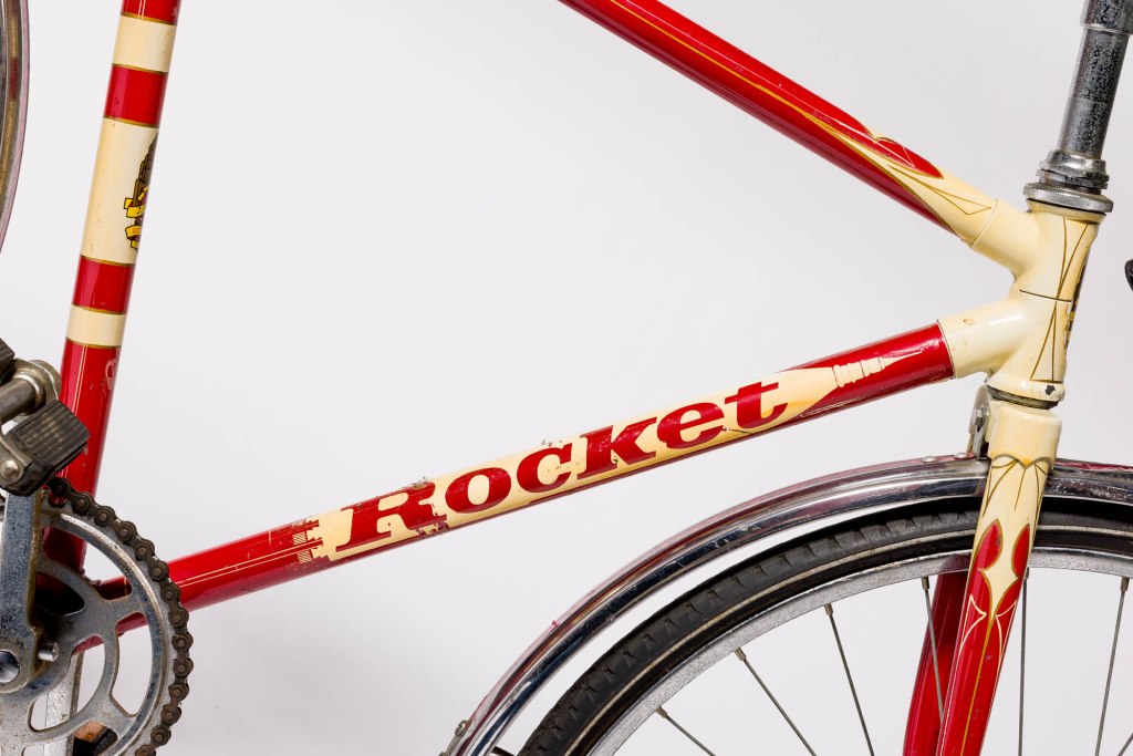 Jack painted his own frames. It is likely that the main colour of both ‘Rockets’ in the collection is ‘Royal Red’, with the lady’s bike decorated in ‘Pale Ivory’, with ‘Cream’ used for the boy’s bike. These colours come from the British Paints Gloss-Masta range. It was an acrylic paint, commonly used for house exteriors, but could be used to paint a bicycle frame using only one coat. The word ‘Rocket’ on both bikes would have been painted using a tubular metal stencil.
